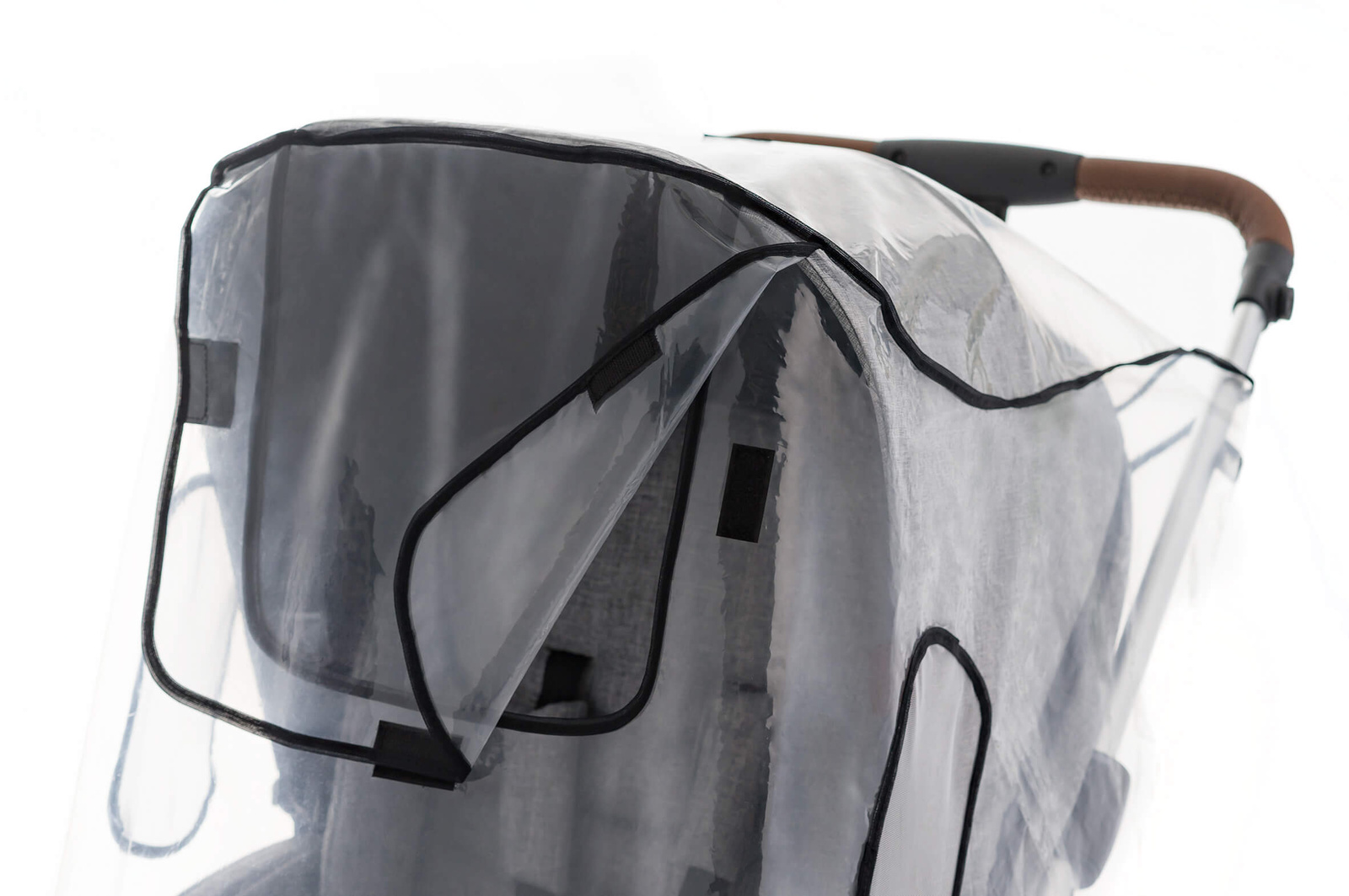At the back, the cover is fastened with Velcro straps, making it easy to put on and take off the stroller.